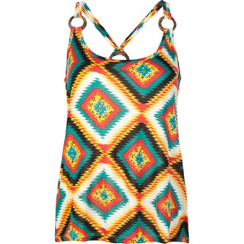 Full Tilt tank. Allover ethnic pattern. Dual strap racerback with O ring accents. Scoop neck. 100% rayon. Hand wash. Imported.