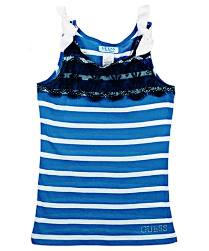 Give her the iconic look of Guess with this cute and stylish top! It features a slightly flared cut, ribbon tie shoulder straps, lace overlay on the chest, and a stripe print. A rhinestone logo sits near the left-side hem. Browse our entire selection of Guess bottoms for a perfect match! 100% Cotton Machine Wash Cold, Inside Out Made in China